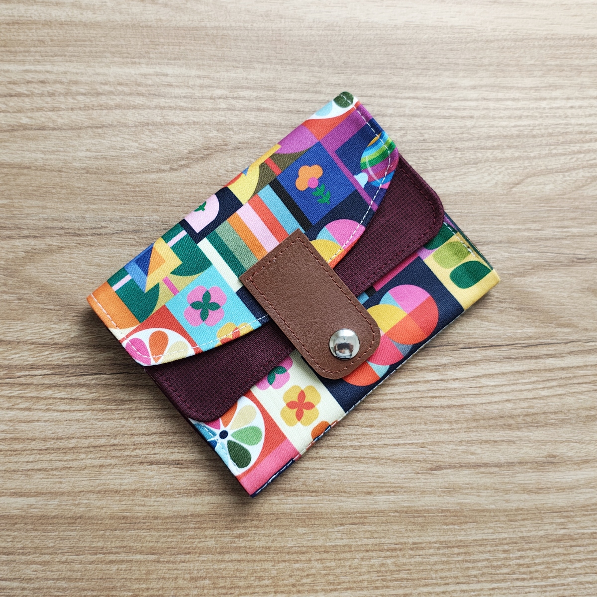 Carteira em tricoline 100% algodão, estampa geométrica e floral, ideal para quem gosta de peças alegres e marcantes.