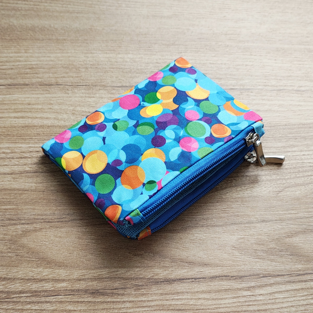 Carteira em tricoline 100% algodão, estampa alegre e vibrante, com círculos coloridos que adicionam um charme divertido no seu dia a dia.