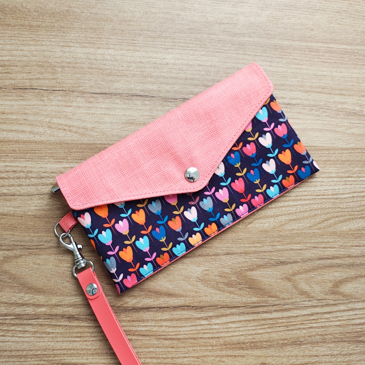 Carteira em tricoline 100% algodão, com estampa vibrante de tulipas, ideal para um look alegre e funcional.